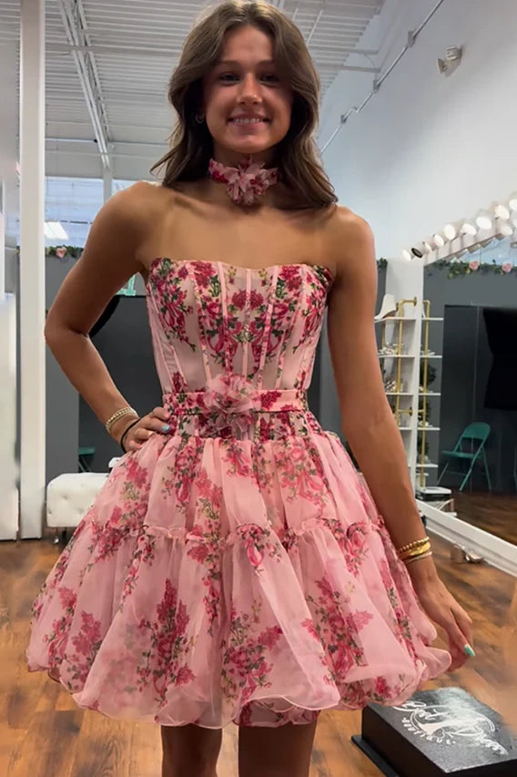Chiffon A-Line Empire Strapless Floral Appliques Homecoming Dress