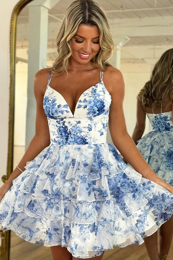 Floral Chiffon A-Line Sweetheart Spaghetti Straps Homecoming Dress