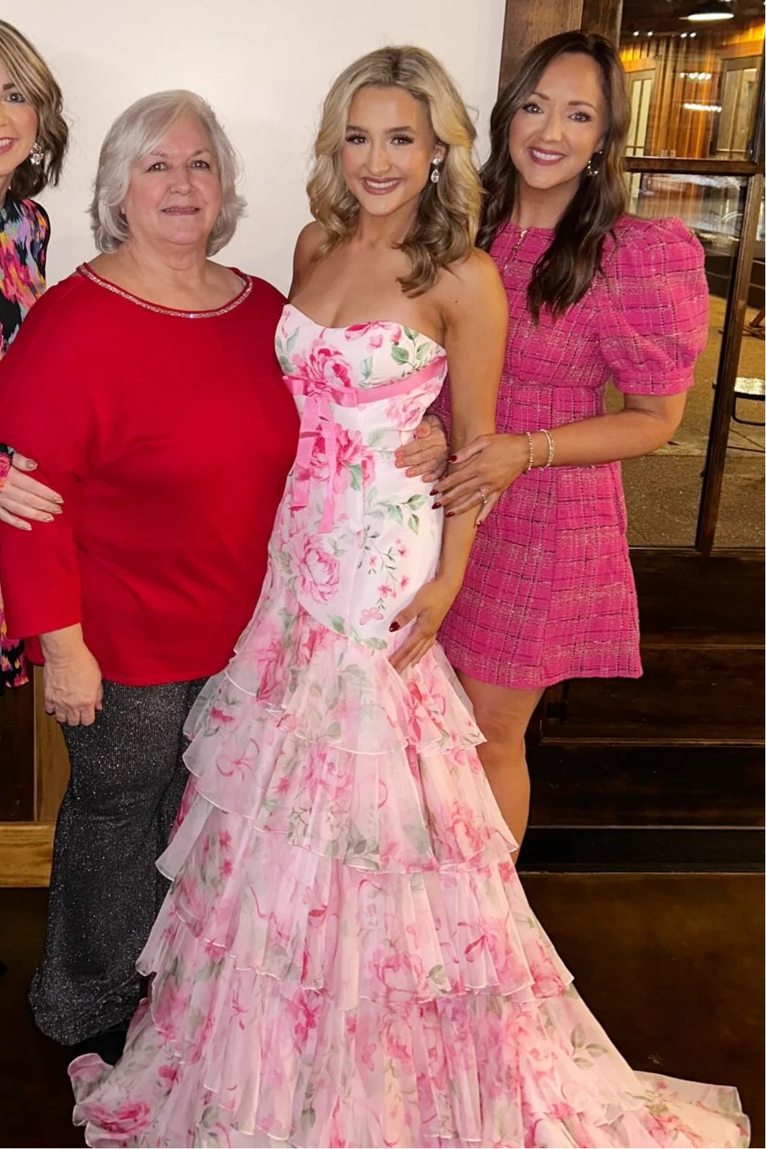 Bateau Strapless Mermaid Chiffon Tiered Floral Prom Dress