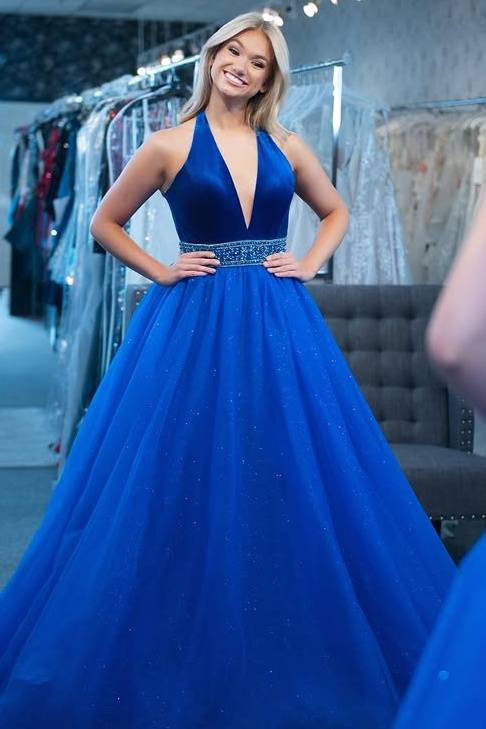 V-Neck Halter Beaded Empire Two Tone Formal Prom Dress