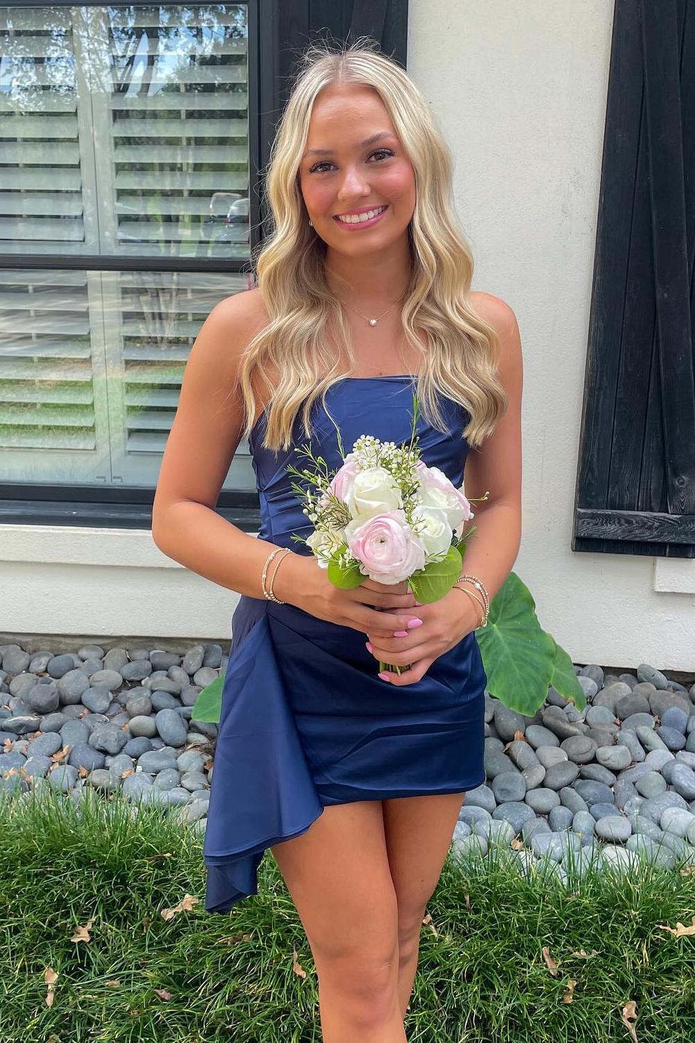 This Cute Satin A-Line Dress features a strapless design with an empire waist that flatters your figure while offering comfortable wear. The smooth satin fabric adds subtle shine, and the A-line silhouette creates an elegant, timeless look. Ideal for homecoming, this dress combines classic feminine style with effortless sophistication.
