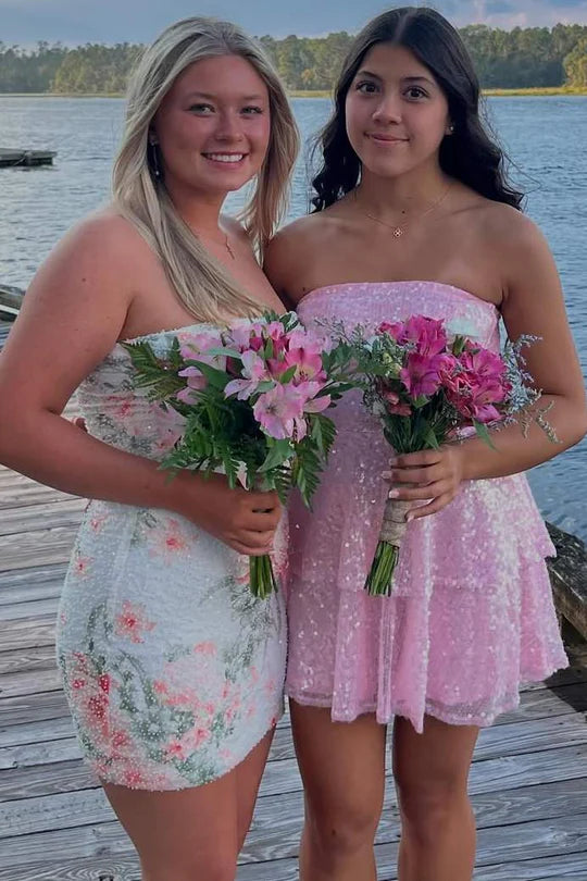 This sparkly strapless homecoming dress features an empire waist that flatters the figure while providing comfort. The A-line silhouette with delicate ruffle accents enhances a graceful flow, and sequins add dazzling sparkle for a standout look. Designed to combine elegance with eye-catching detail, this dress is perfect for making a memorable impression at any event.