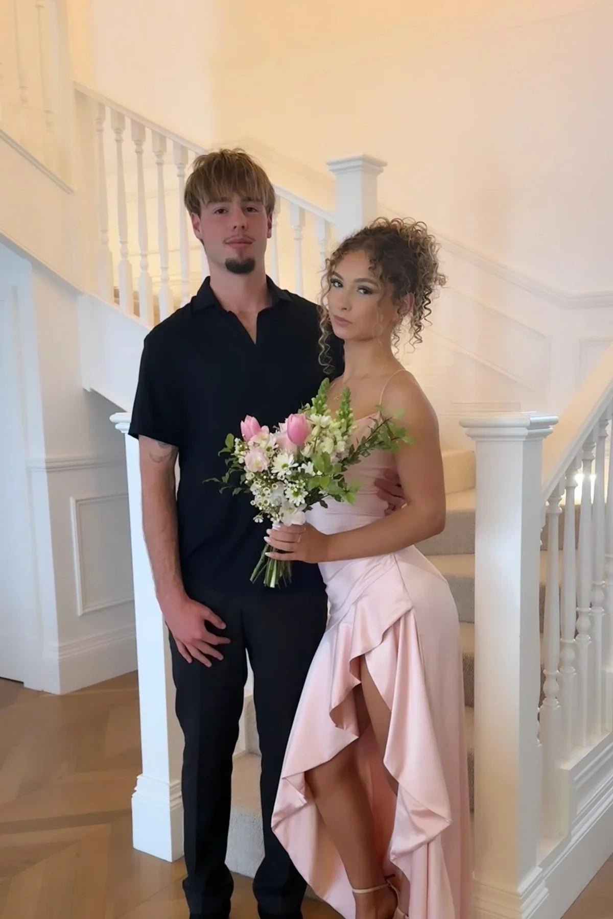 This satin party prom dress features a sophisticated bateau neckline paired with delicate spaghetti straps for a balanced and elegant design. The fitted silhouette is enhanced by a ruffle-accented slit, adding dynamic movement and subtle allure. Crafted from smooth satin, the dress offers both comfort and a refined sheen, making it an excellent choice for formal occasions where style and grace are paramount.
