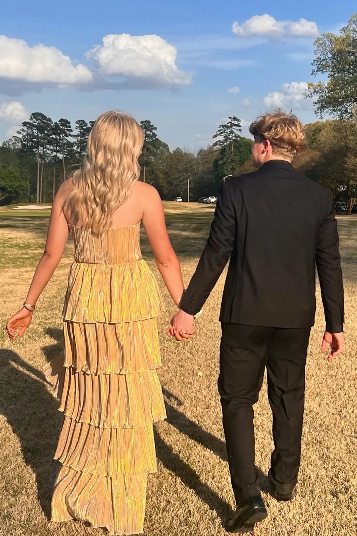 Twirl into the night in this absolutely adorable strapless beauty that's pure romance and fun. The sweetheart neckline is flirty and feminine, while delicate pleats add texture and visual interest throughout. Charming tiered layers create beautiful dimension and movement, giving...