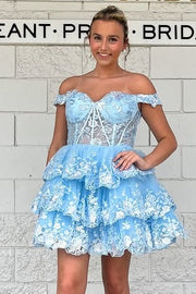 A-Line Off-Shoulder Open Back Lace Tiered Sparkly Homecoming Dress