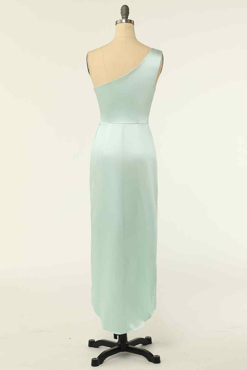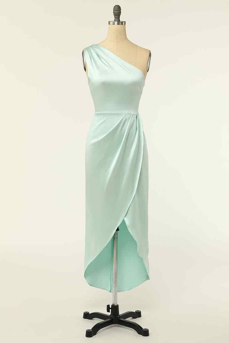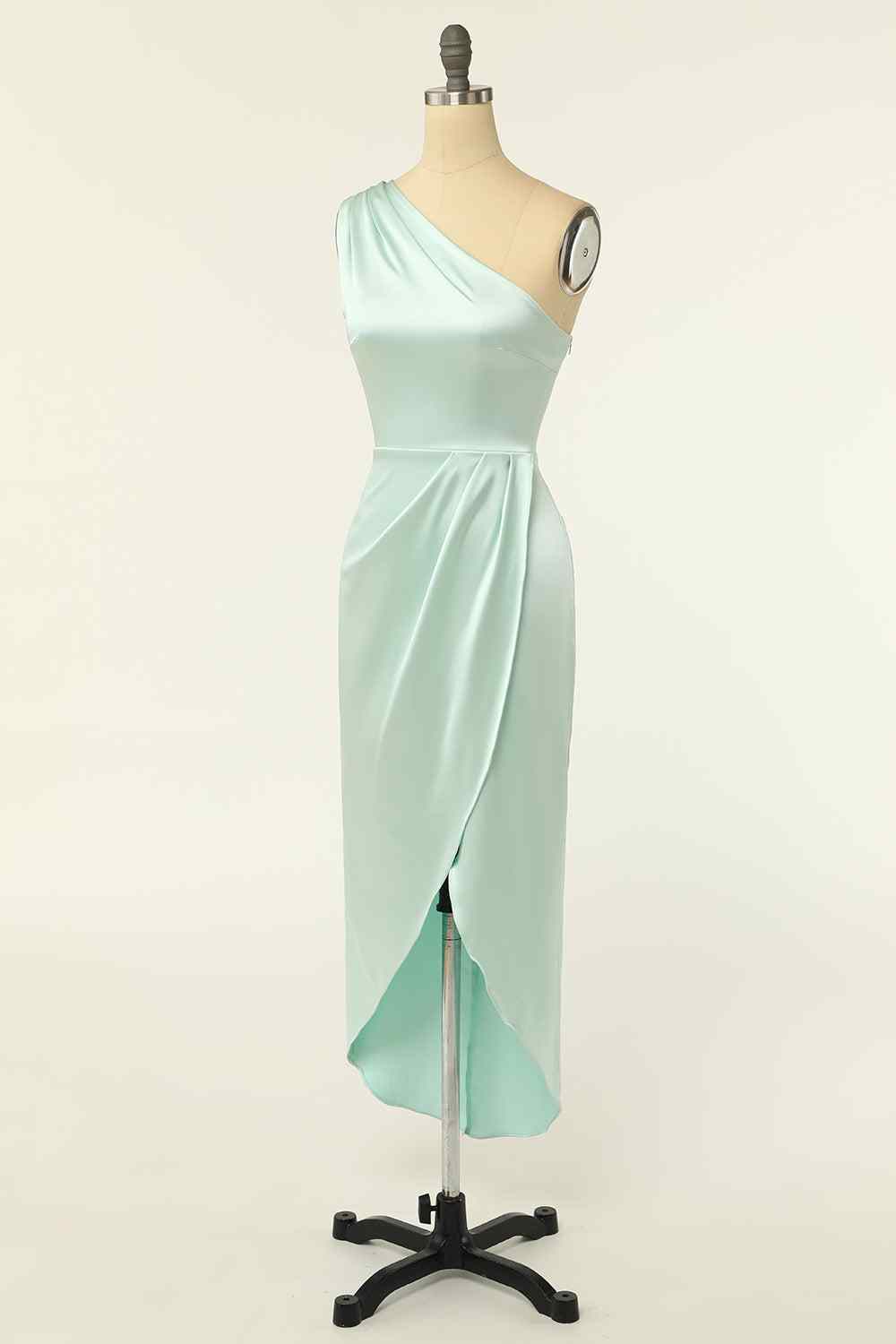 Agave Faux-wrap One Shoulder Satin Pleated Knee Length Bridesmaid Dress
