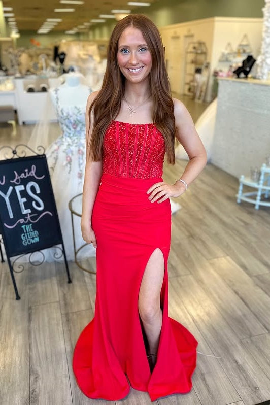 Bateau Sleeveless Beaded Empire Mermaid Long Party Prom Dress