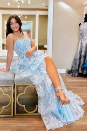 Bateau Sleeveless Lace Tiered A-Line Party Prom Dress With Slit