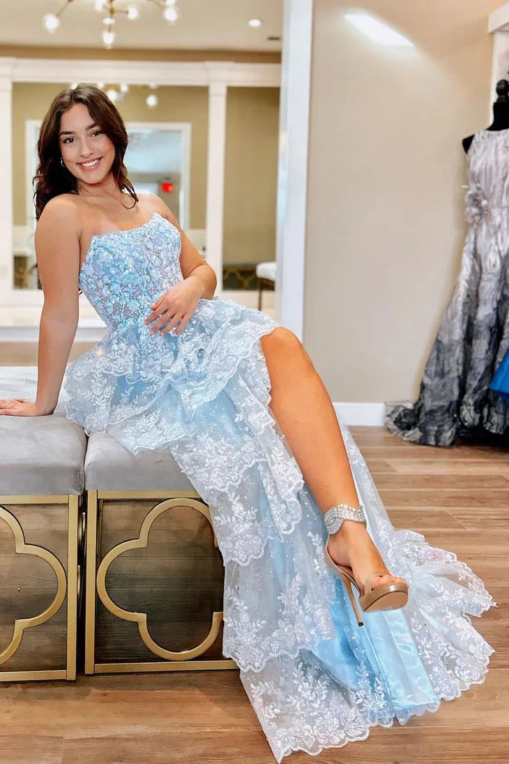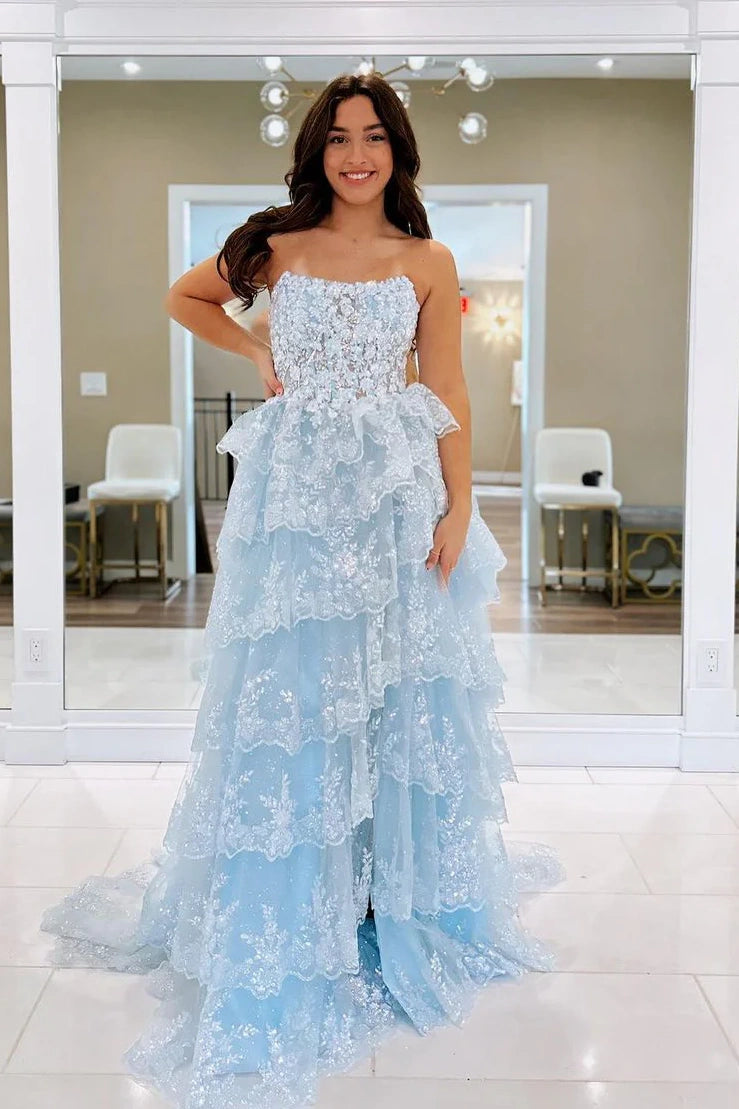 This elegant Bateau Sleeveless Lace Tiered A-Line Party Prom Dress With Slit combines delicate lace and a flowing tiered design to create a stunning silhouette. The bateau neck and sleeveless style add a touch of sophistication, while the subtle slit adds a modern edge. Perfect for any formal occasion.