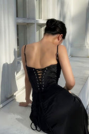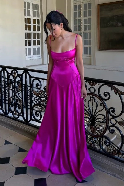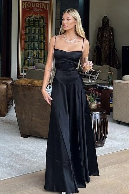 Bateau Spaghetti Straps Satin A-Line Long Party Prom Dress