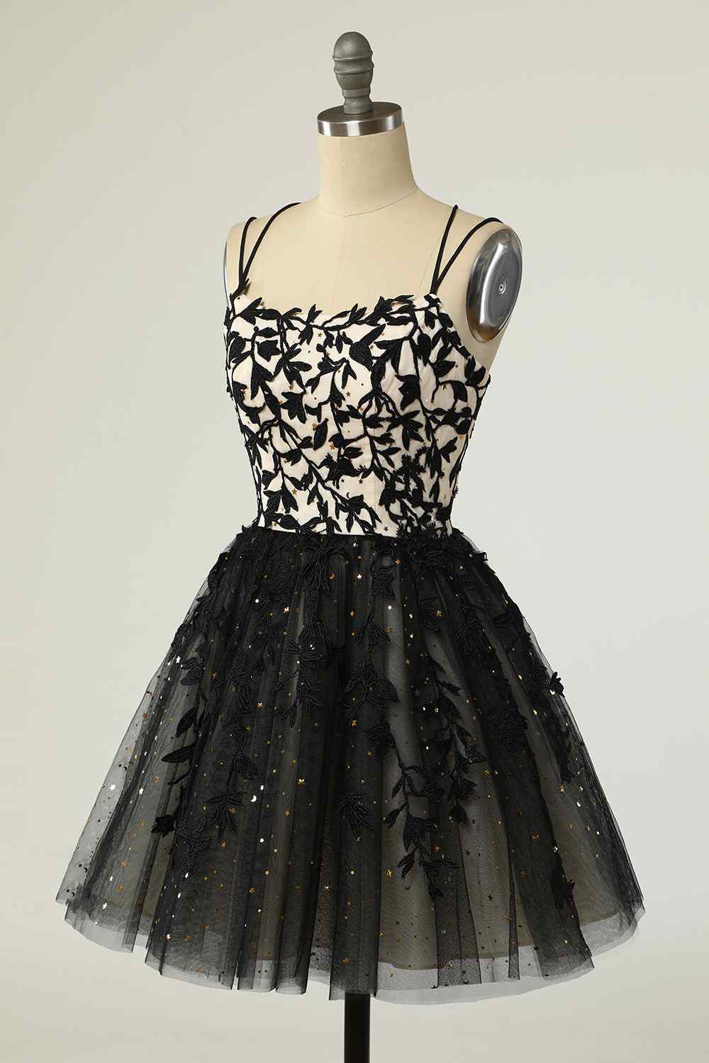 Black A-line Double Spaghetti Straps Lace-Up Applique Mini Homecoming Dress