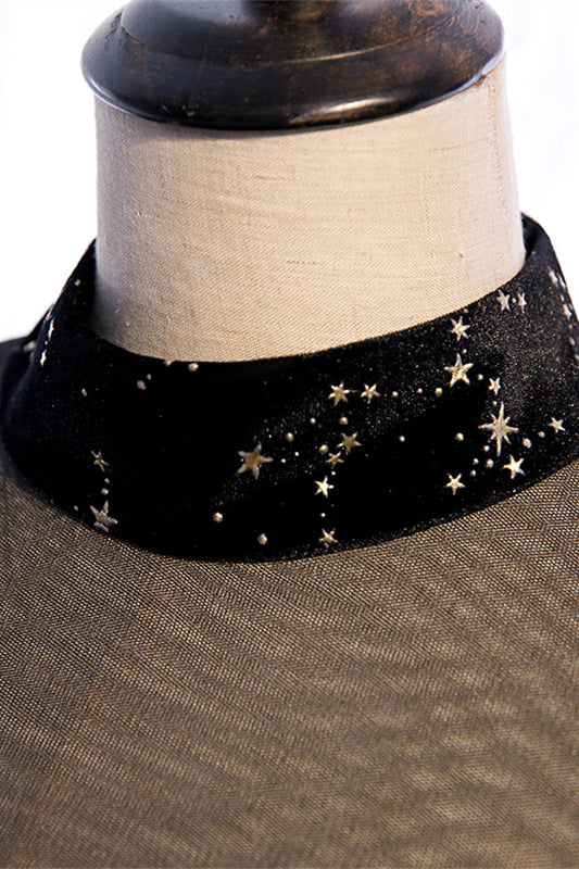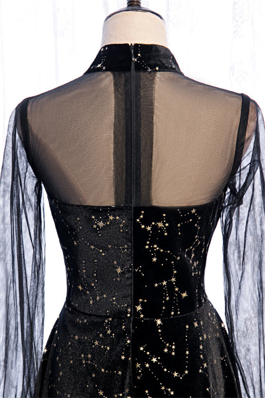 Joyofdress this A-line silhouette dress features a sweetheart neckline with an illusion high neck and long sleeves, a corset bodice with a zip-up back closure, and the look is complete with the full gold star-shaped prints on the calf-length skirt with the flare at the hemline.