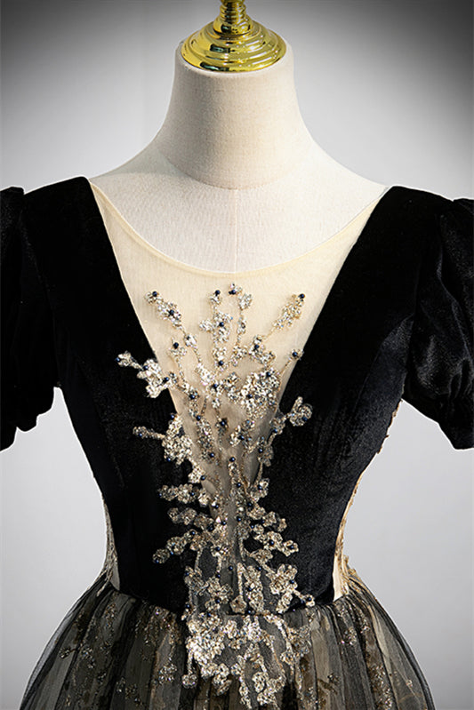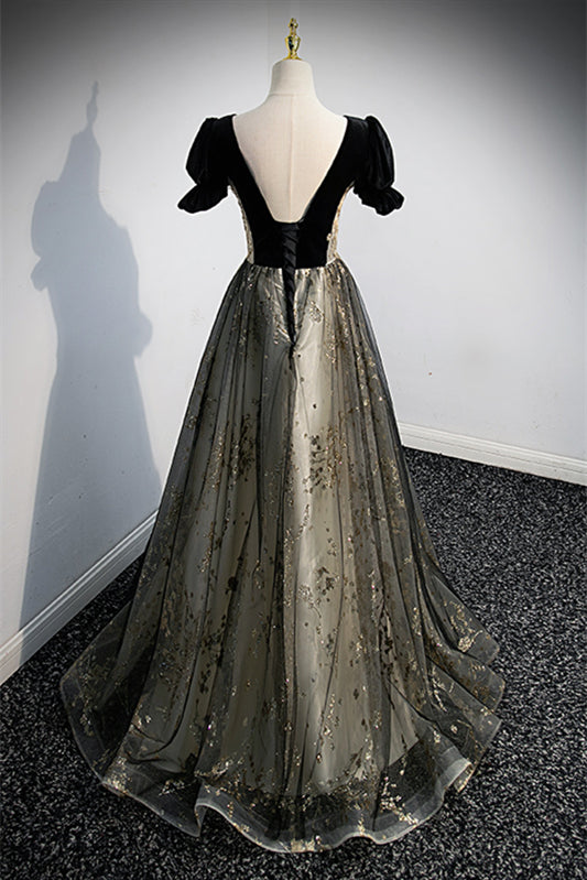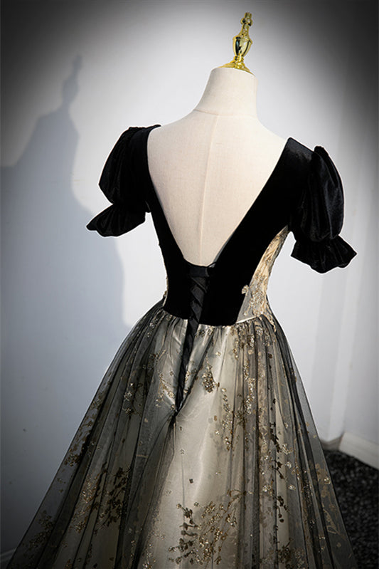 Make a stunning entrance in this sophisticated prom dress that combines timeless elegance with modern allure. The sheer deep V-neckline draws attention upward while the backless design creates an unforgettable silhouette. Delicate appliqués add refined detail and texture throughout, while the classic A-line cut flatters every figure with graceful movement. Perfect for prom, formal galas, or any special occasion where you want to command attention with understated glamour.