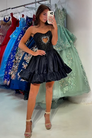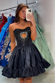 Black Satin A-Line Strapless Beaded Ruffle Homecoming Dress