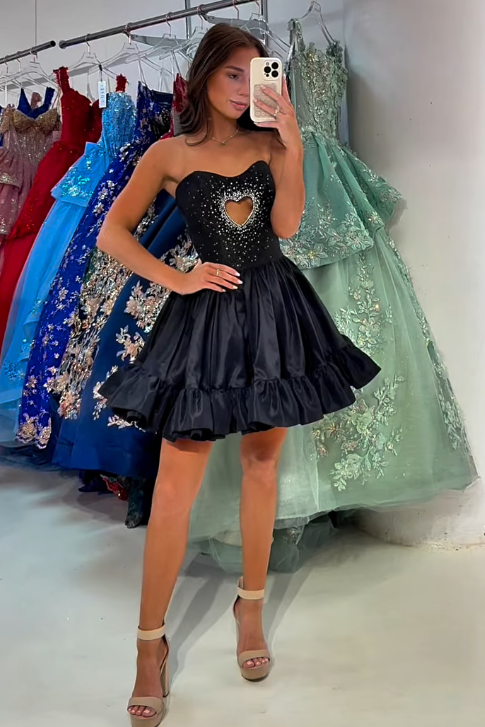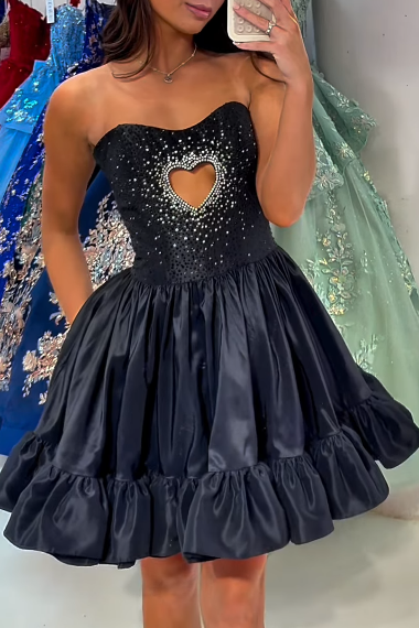 This striking black satin homecoming dress combines timeless elegance with contemporary design elements. The strapless silhouette provides a sophisticated foundation, while the A-line cut creates a universally flattering shape. Meticulously placed beading adds subtle luminosity against the rich satin fabric, and strategic ruffle detailing introduces dimensional texture and movement. The premium construction ensures structural support while maintaining a refined aesthetic, making this dress an exceptional choice for homecoming events where distinctive elegance is desired.