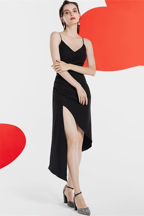 Joyofdress this dress features a deep V neckline with spaghetti straps, a corset bodice with ruched detail that run down to the hem, and a high-low silhouette with a leg slit.
