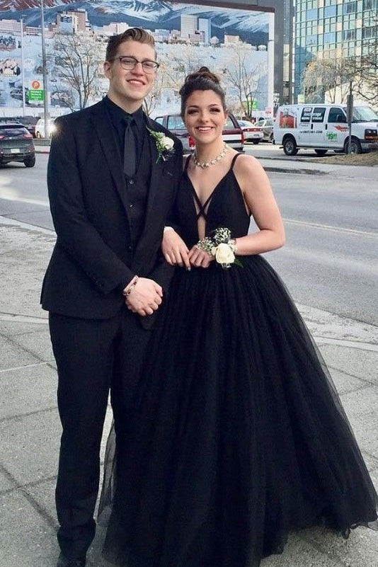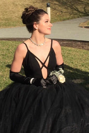 Black Tulle A-Line V-Neck Spaghetti Straps Wedding Dress