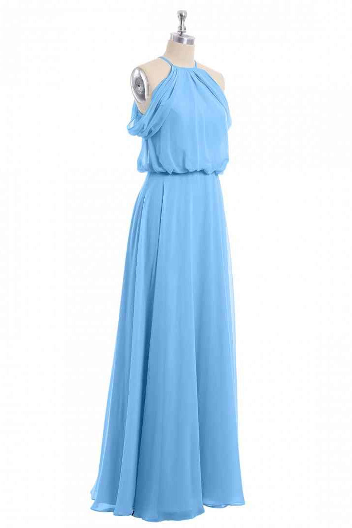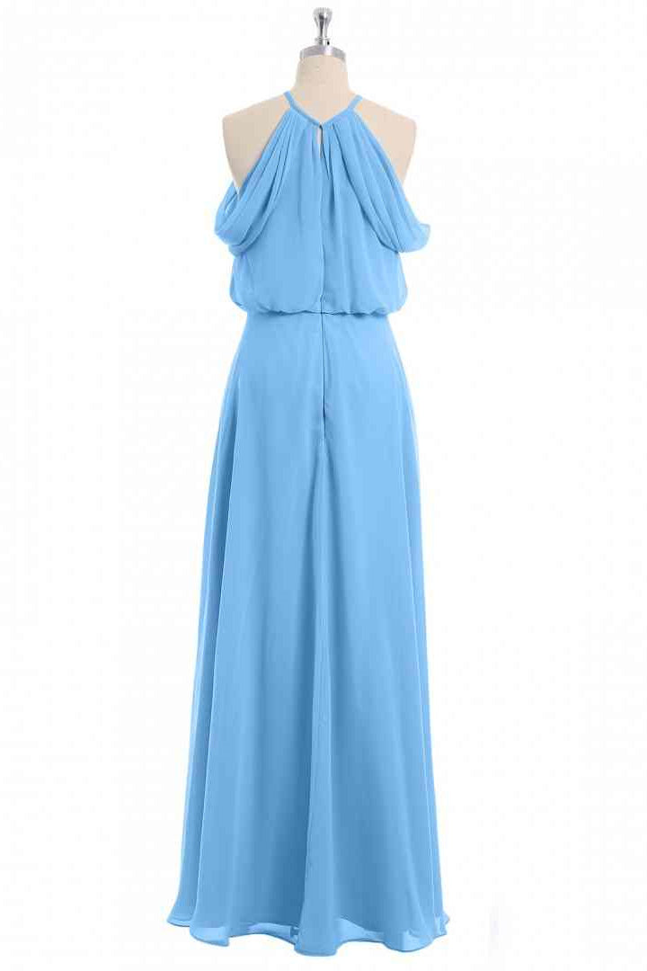 Blue A-line Halter Off-Shoulder Chiffon Long Bridesmaid Dress