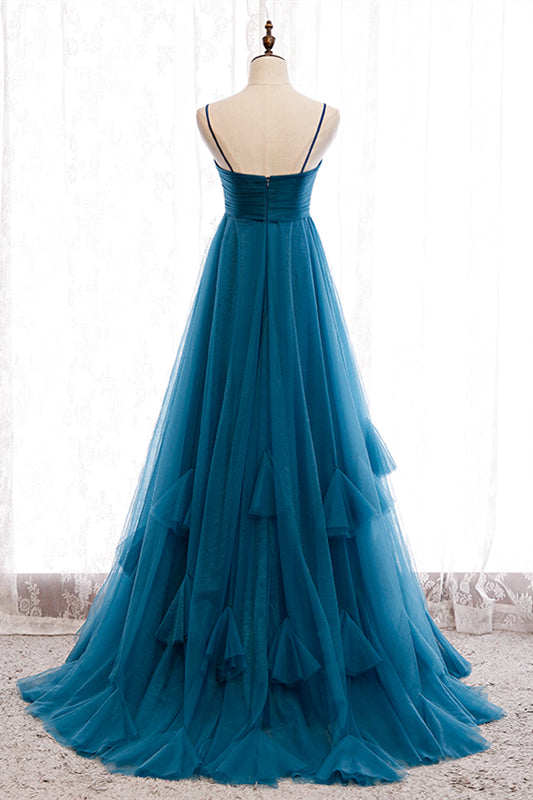 Blue Pleated Straps Ruffle Layers A-line Sweeping Maxi Formal Dress