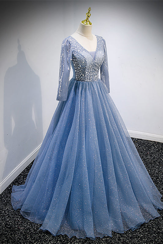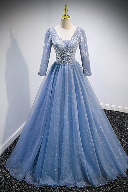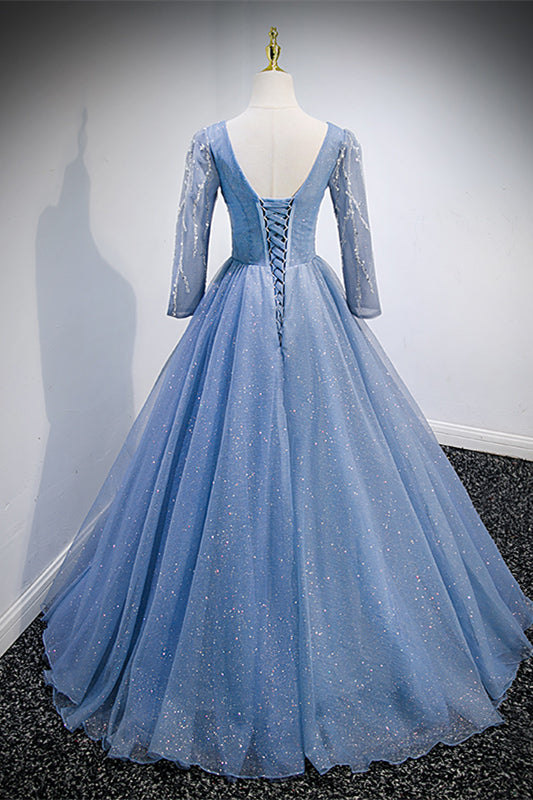 Sparkly Tulle A-Line 3/4 Sleeves Empire Long Party Prom Dress