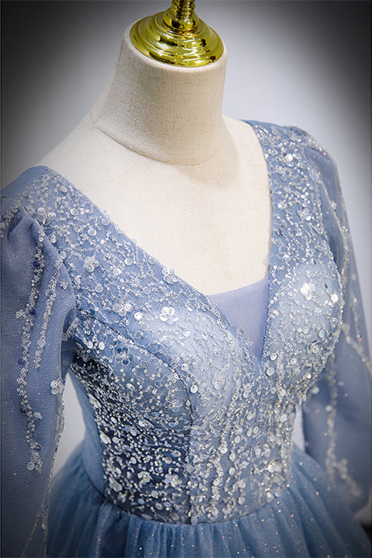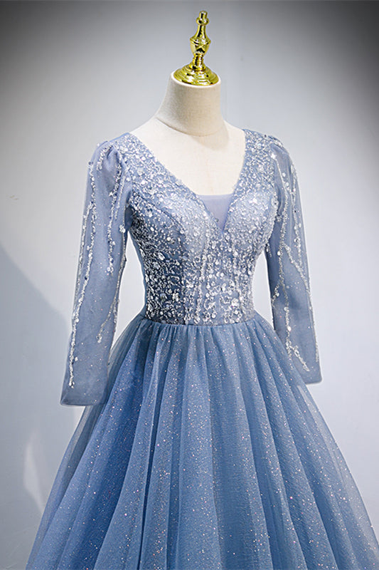Elevate your evening with this sophisticated sparkly tulle prom dress, designed to make a lasting impression. The flattering A-line silhouette creates an elegant flow from the empire waistline, while shimmering tulle fabric catches the light with every movement. Three-quarter sleeves offer refined coverage and a timeless appeal, making this gown versatile for proms, galas, and formal celebrations. The long length provides classic glamour, and the intricate sparkle detailing ensures you'll stand out in any crowd. Perfect for those seeking a balance between modern style and traditional elegance.