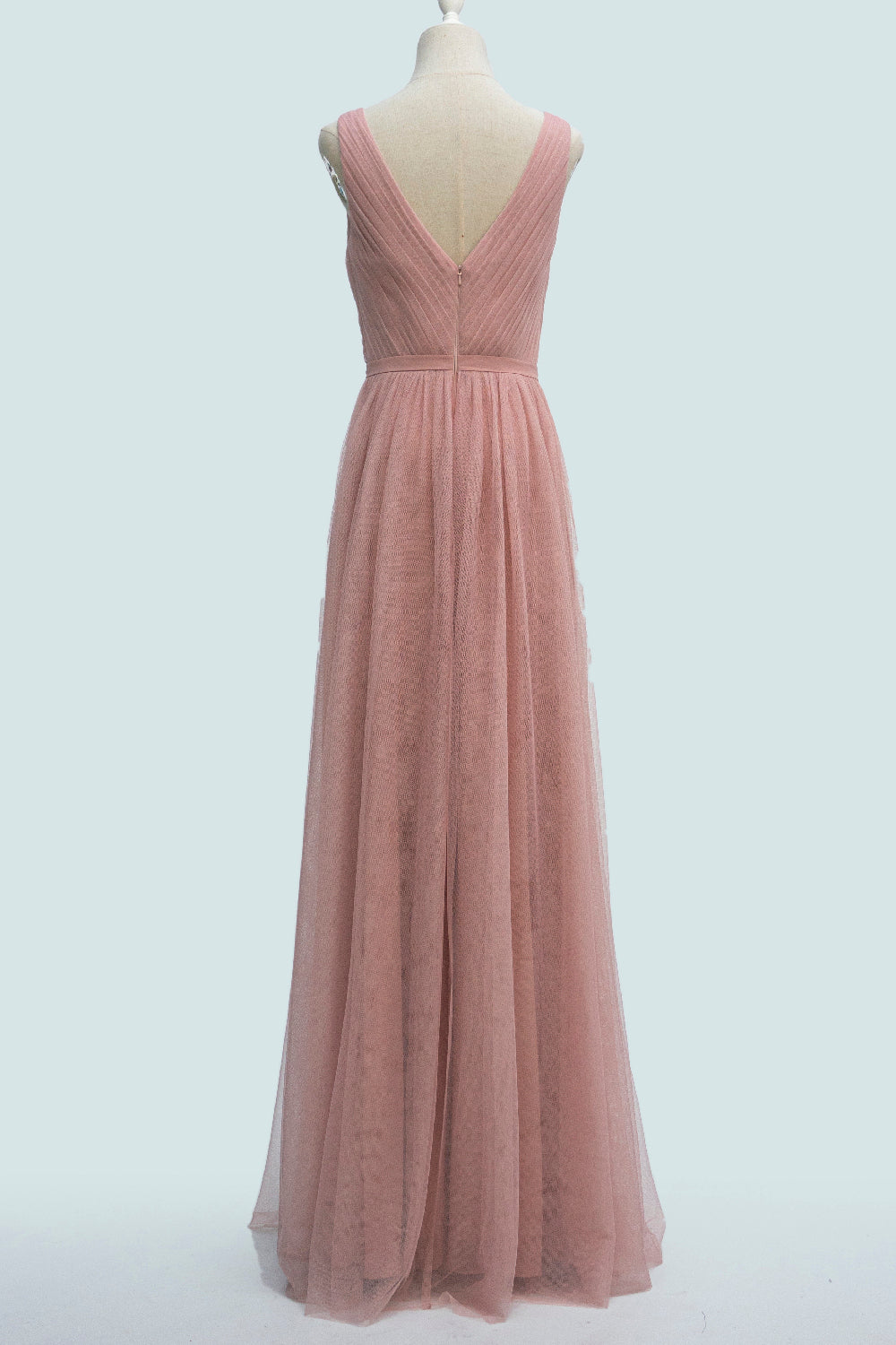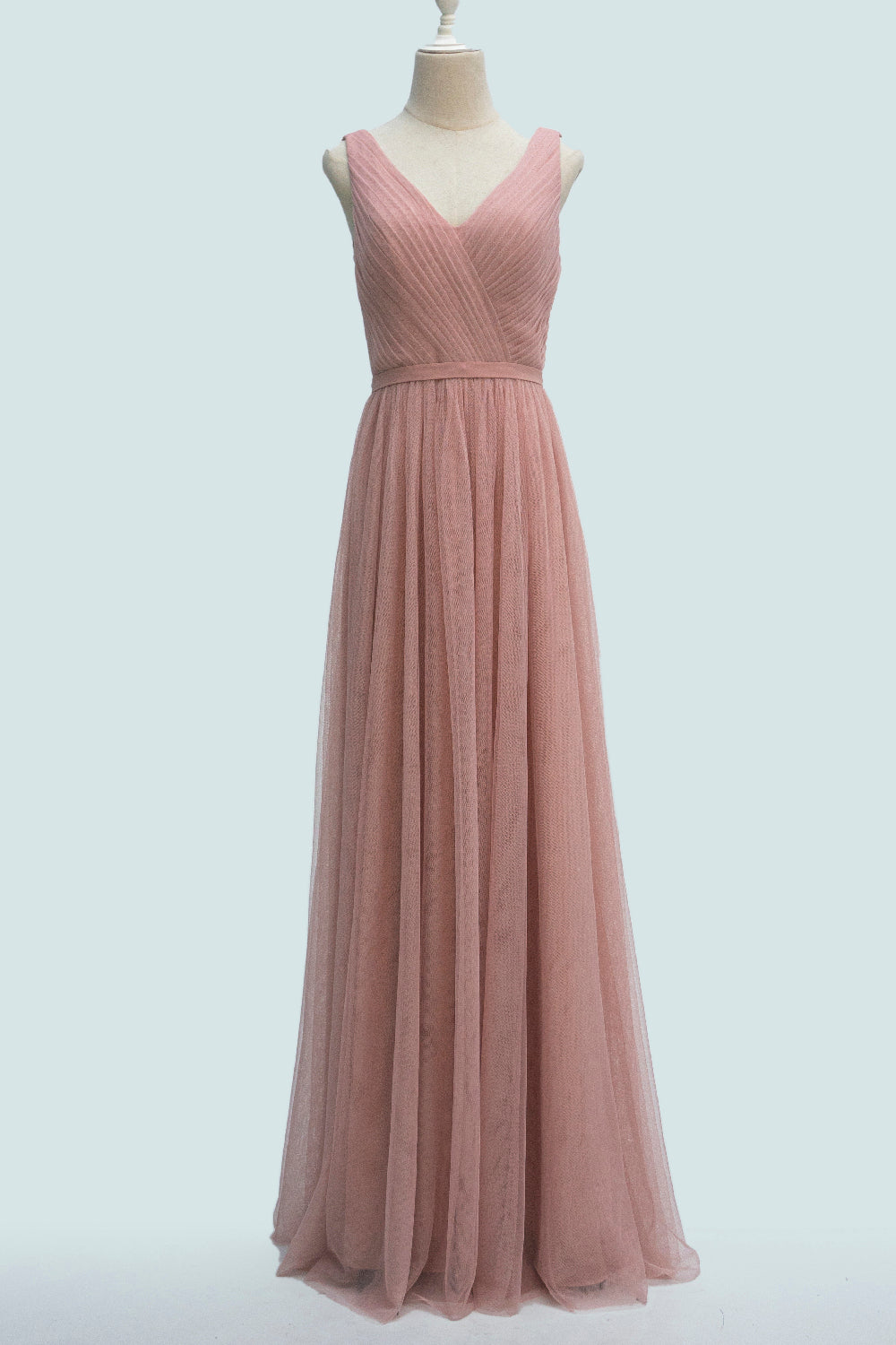 Blushing Pink A-line V-Neckline Pleated Long Bridesmaid Dress
