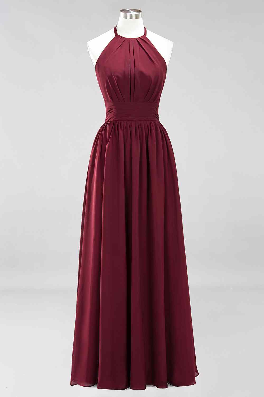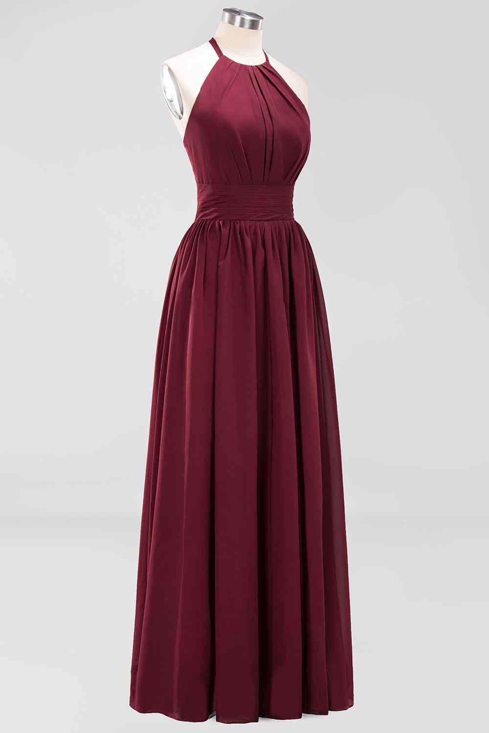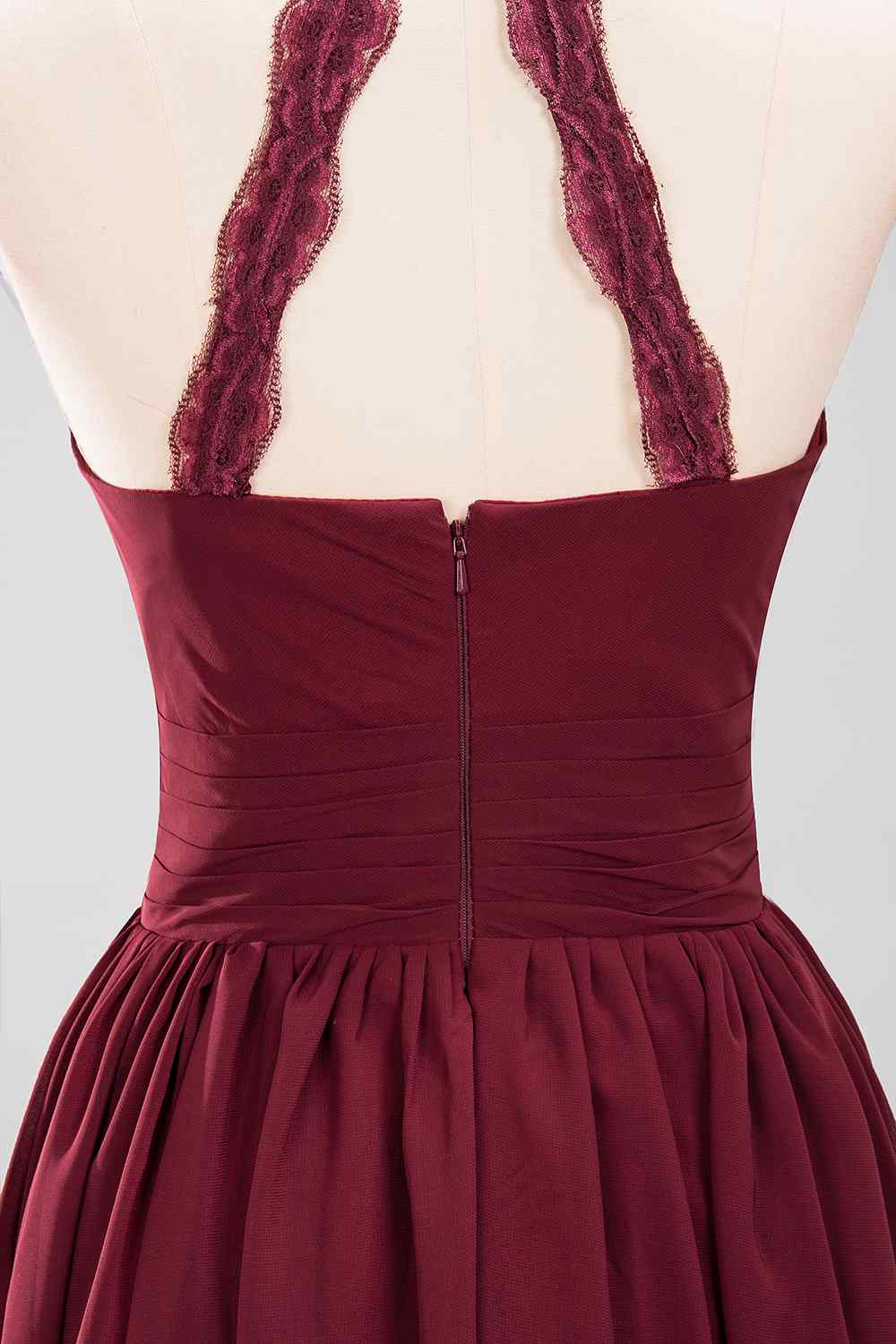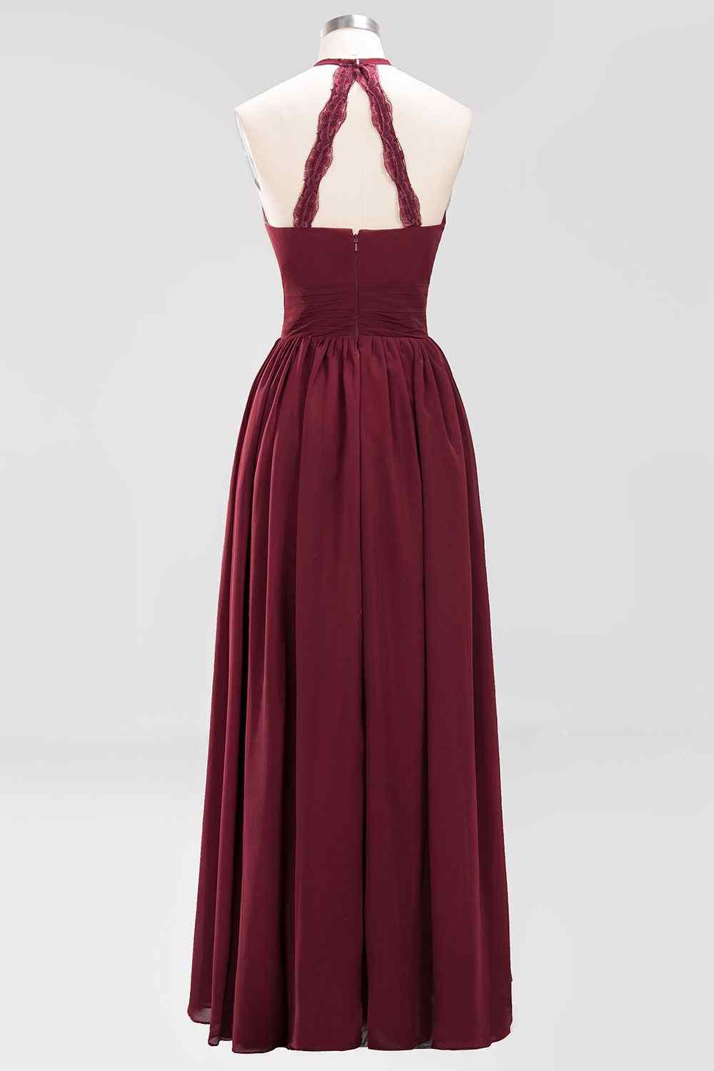 Burgundy A-line Halter Lace Straps Back Pleated Chiffon Long Bridesmaid Dress