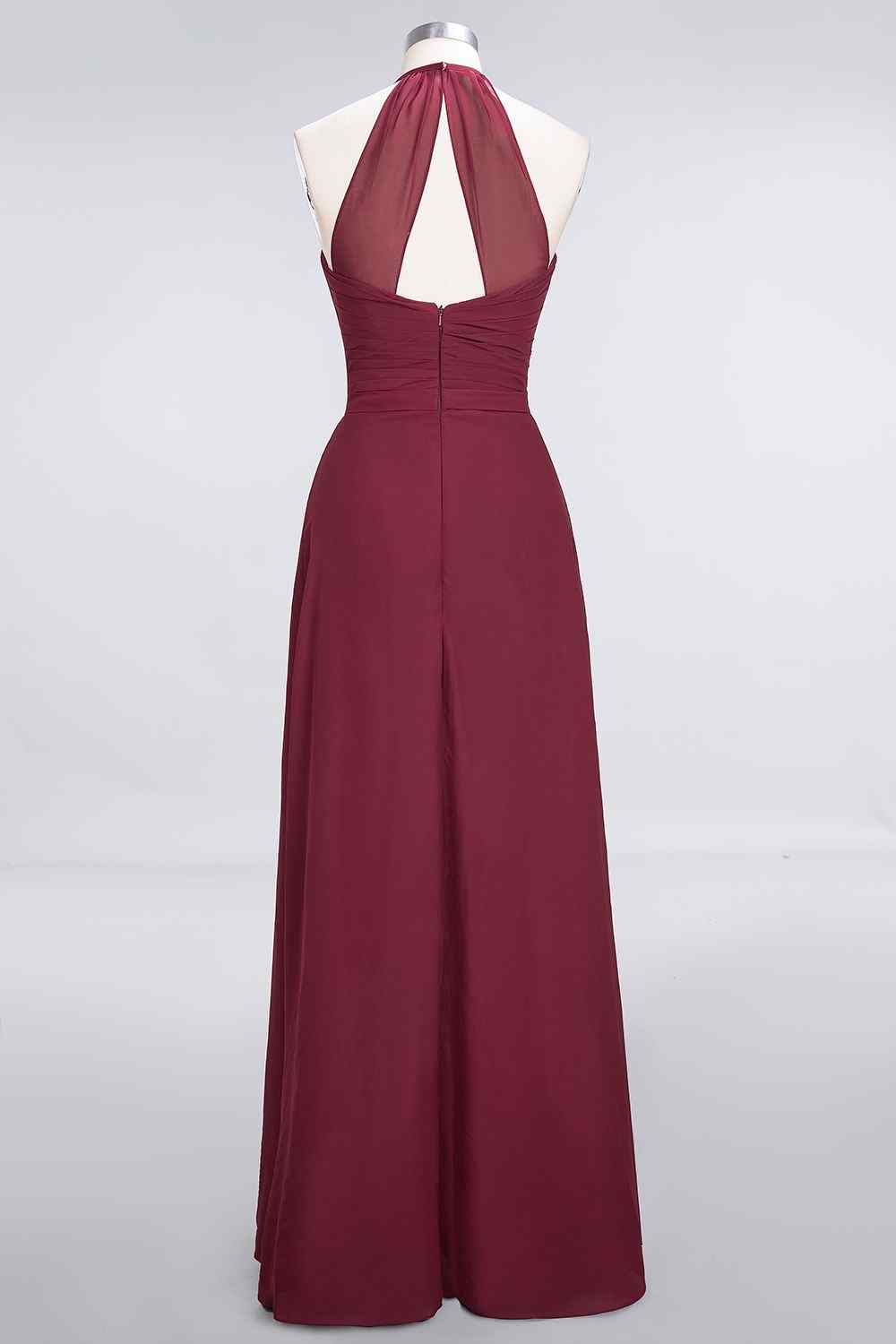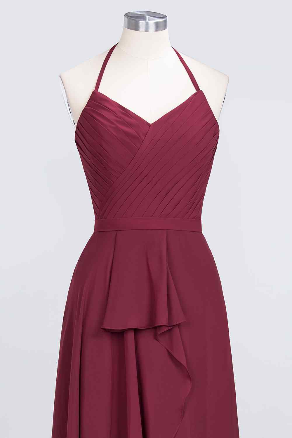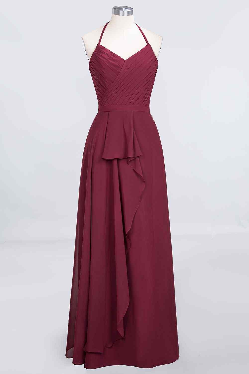 Burgundy A-line Halter Neck Cut-Out Chiffon Ruffle Long Bridesmaid Dress