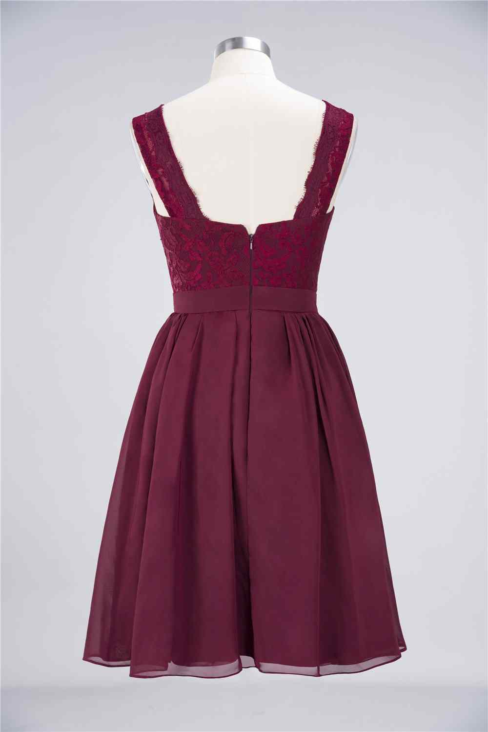 Burgundy A-line Jewel Neck Lace Chiffon Mini Bridesmaid Dress