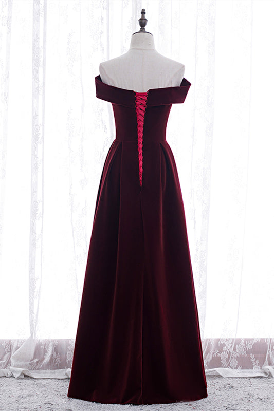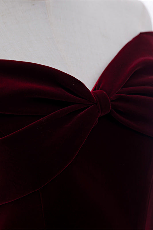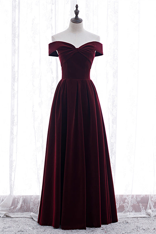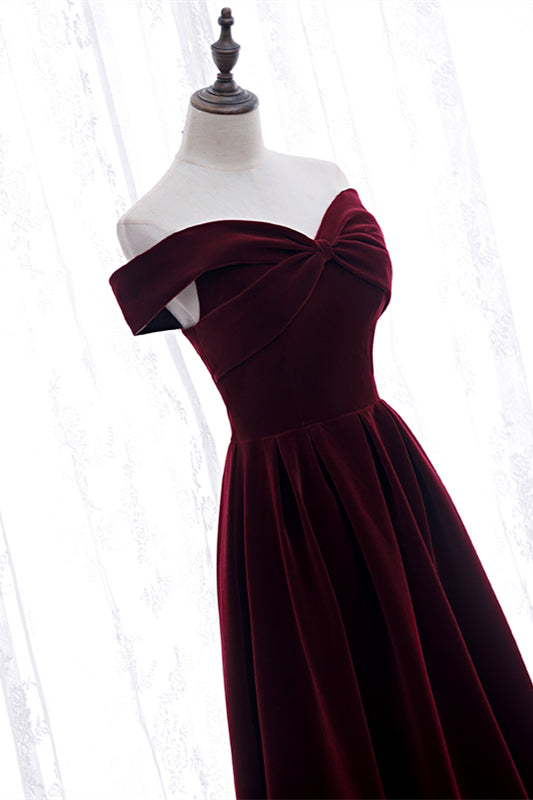 Burgundy A-line Off-the-Shoulder Pleated Bow Velvet Maxi Formal Dress
