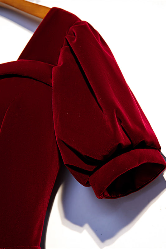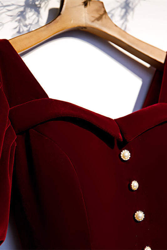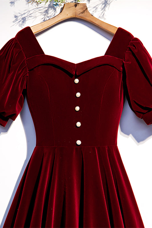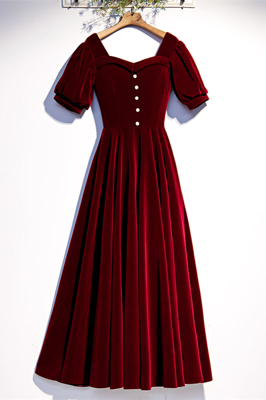 Burgundy A-line Puff Sleeves Folded Neck Tea Length Formal Dress with Button