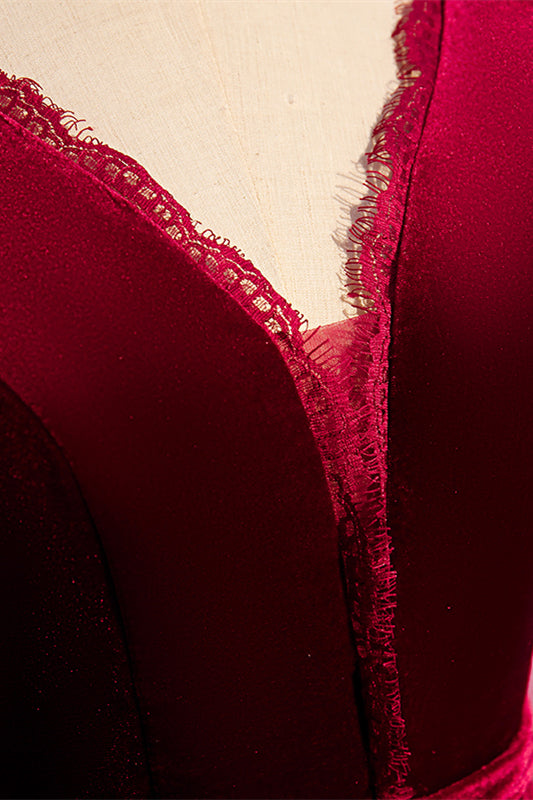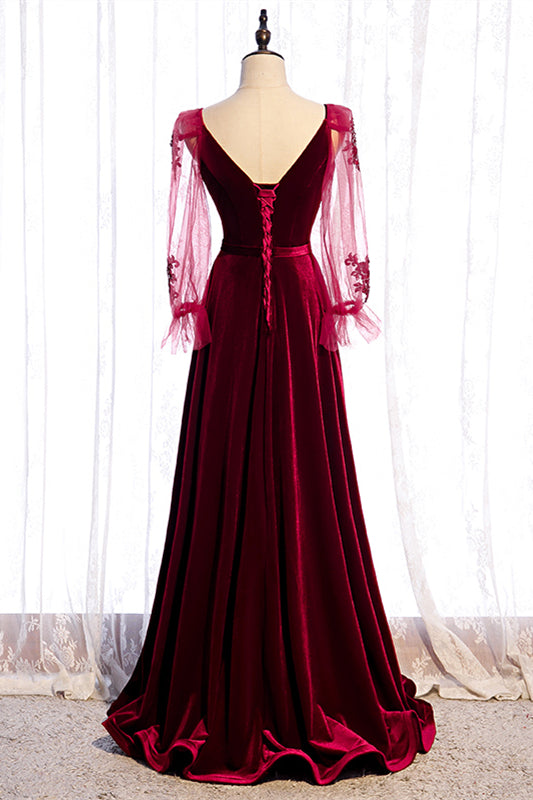 Burgundy A-line V Neck Long Sleeves Beaded Appliques Maxi Formal Dress