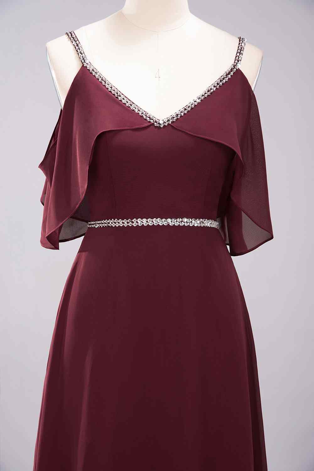 Burgundy A-line V Neck Off-the-Shoulder Beading Chiffon Long Bridesmaid Dress