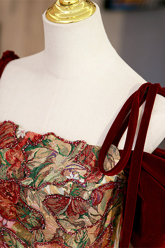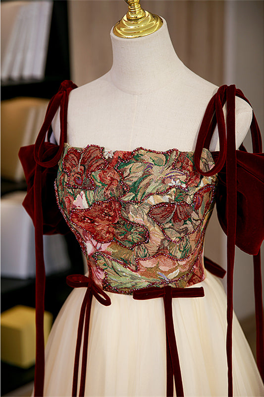 Burgundy and Champagne Off-the-Shoulder Bow Tie Beaded Maxi Formal Dress