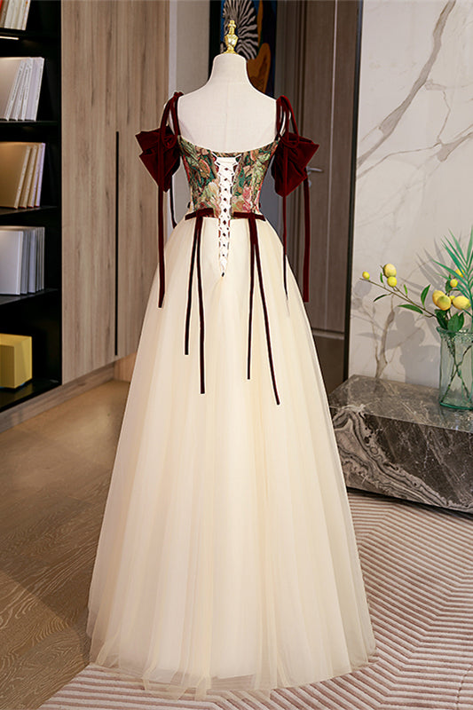 Joyofdress this A-line silhouette dress features an off-the-shoulder neckline with spaghetti straps now tie shoulder, a beaded corset bodice with lace-up back detail, and a floor-length skirt with bow ties at the waist.