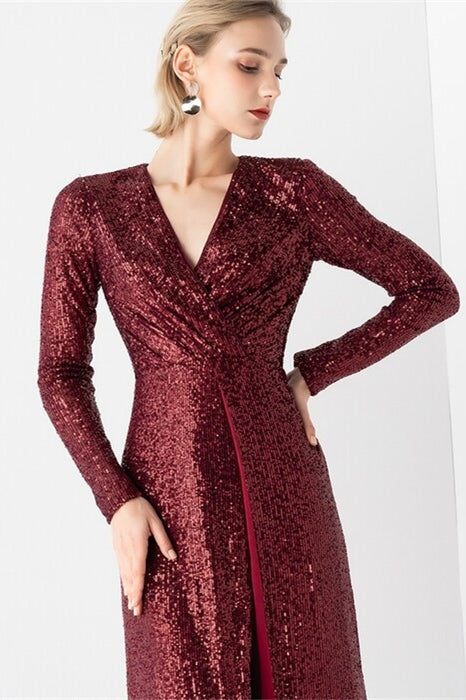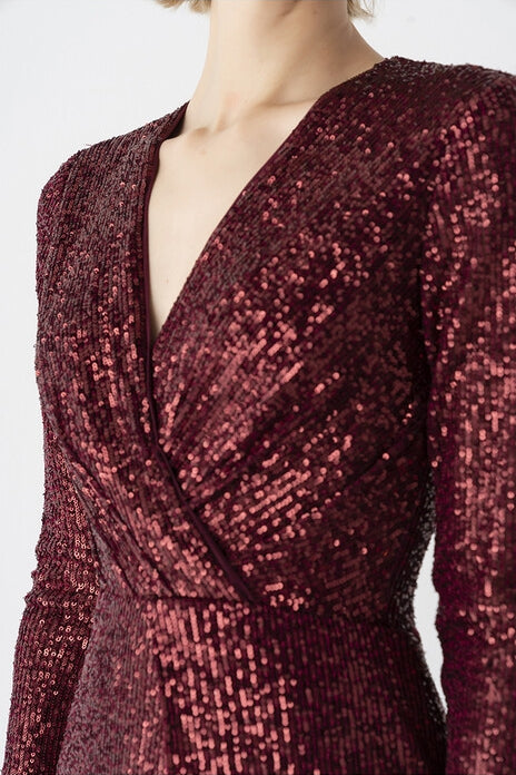 Joyofdress burgundy sequined long evening dress with long sleeves and a wrap front.