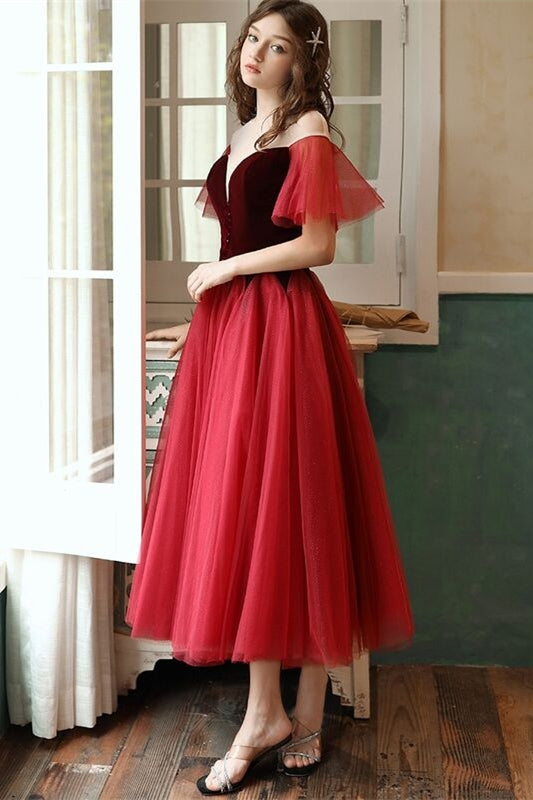Joyofdress This dress features an illusion sheer mesh neckline with a plunging V-neck and an off-the-shoulder neckline with flaunting sleeves, and a tea-length skirt with lace-up back detail.