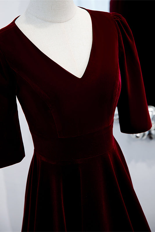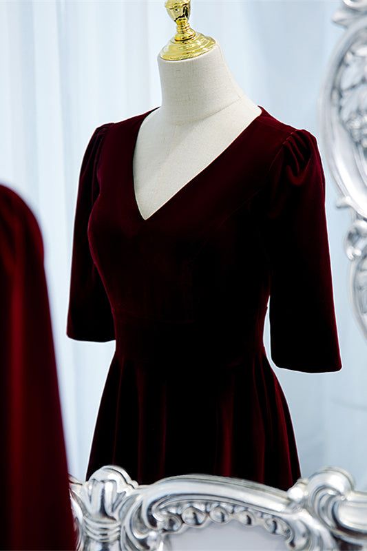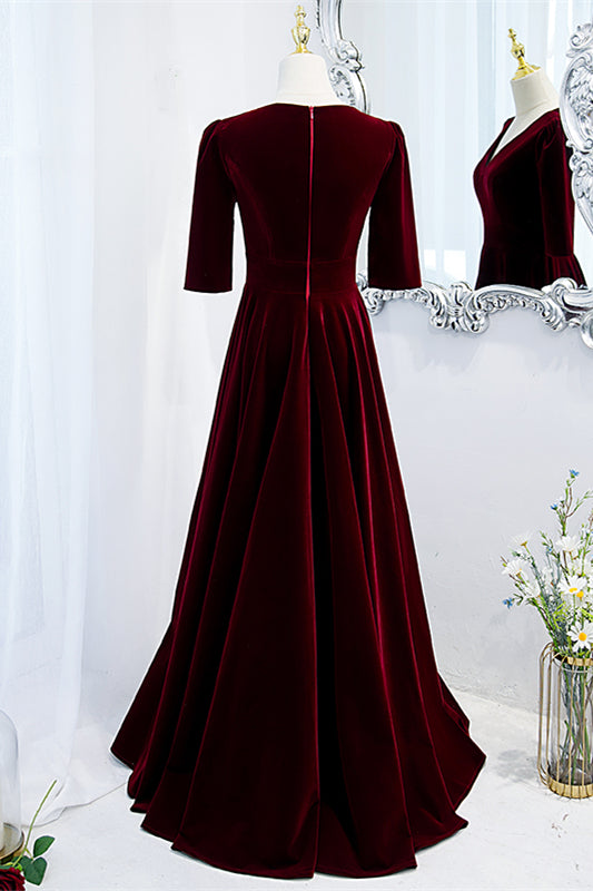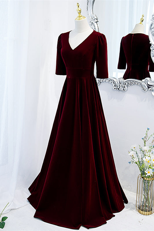 Burgundy V Neck Half Sleeves Velvet Maxi Formal Dress