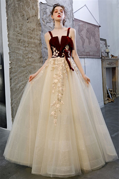 Burgundy Velvet and Champagne Tulle Formal Dress