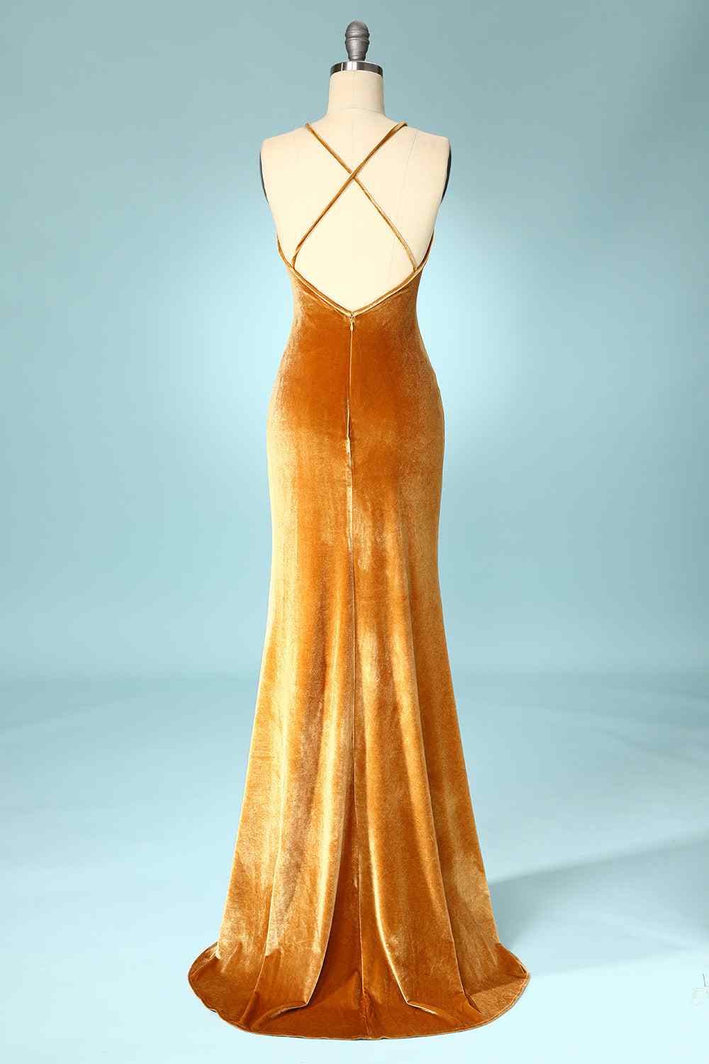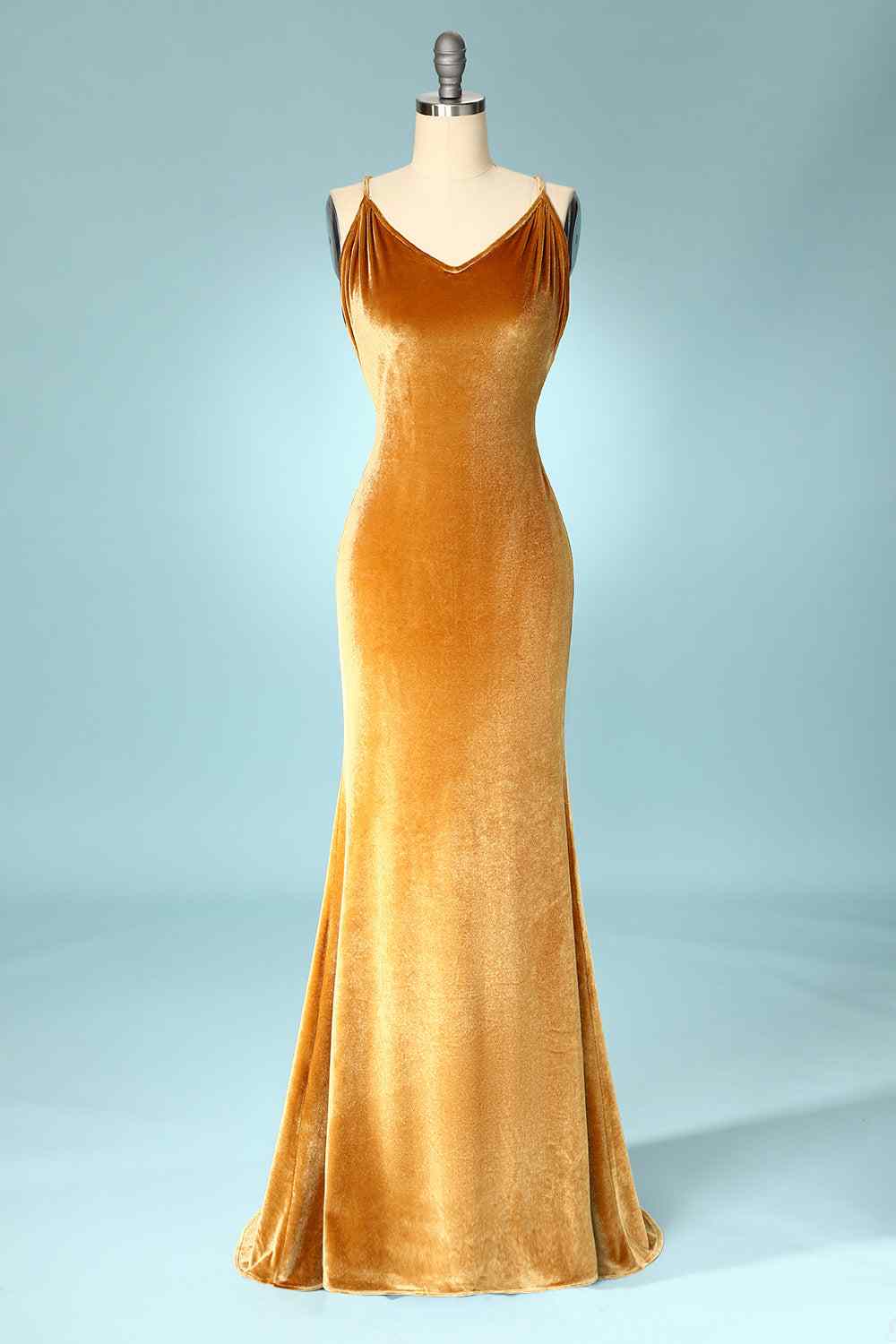 Butterscotch Mermaid Cowl Neck Backless Velvet Long Bridesmaid Dress