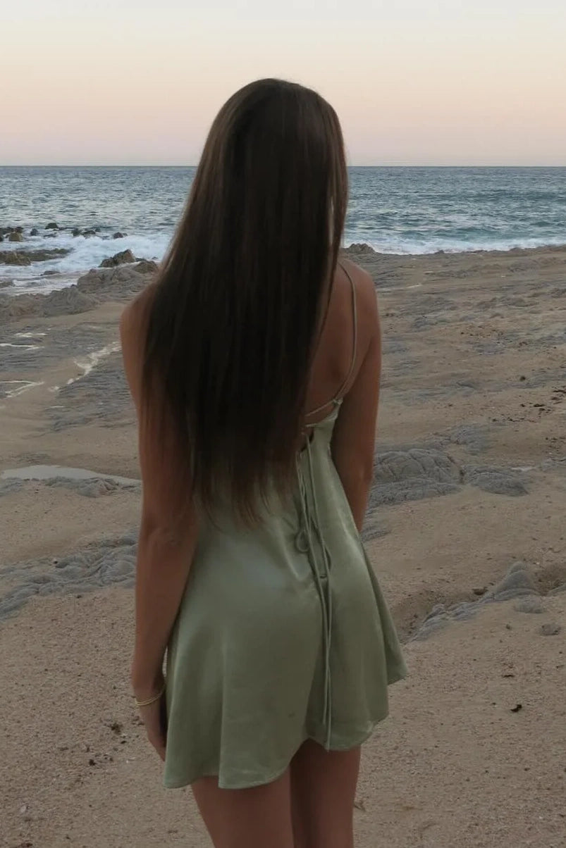 This casual satin dress features an A-line silhouette with a flattering V-neck and sleeveless, backless design, perfect for homecoming parties. The smooth satin fabric offers a subtle shine, combining comfort with understated elegance. Its flowy cut ensures ease of movement while highlighting your natural shape for a confident, stylish look.