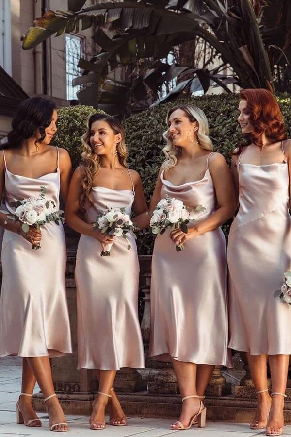 Casual Satin Spaghetti Straps Midi Bridesmaid Dress