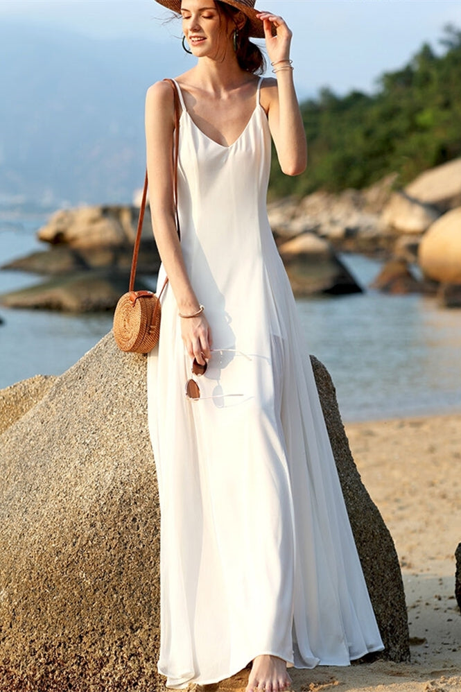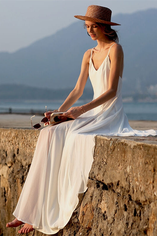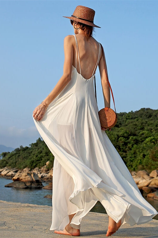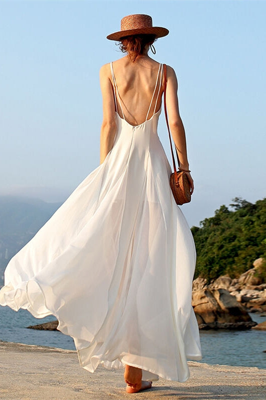 Joyofdress Exclusive! You will fall in love with the casual white chiffon long dress with an open back.