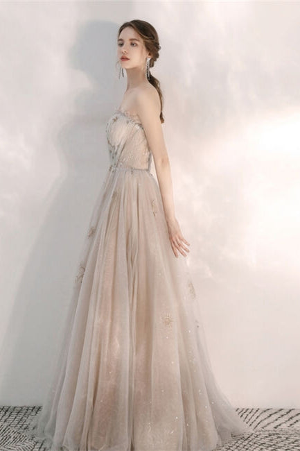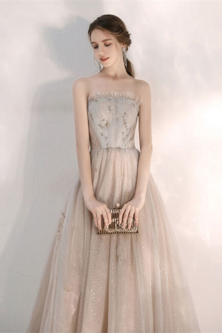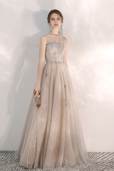 Look like a real princess in this Champagne Formal Dress. Featuring a strapless neckline and sequin layer tulle. Joyofdress offers 10% Off with code: JOY5 for over $150  shopping. You can get the coupon with our bras