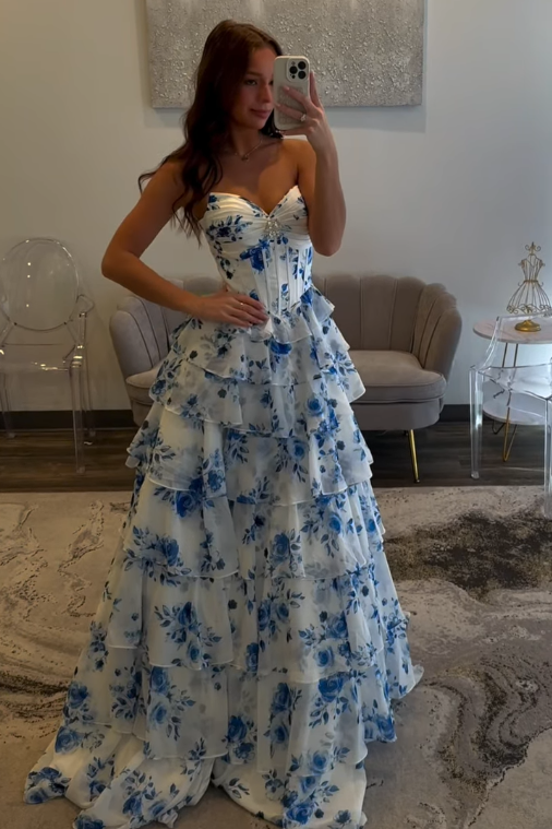 Chic Chiffon A-Line Sweetheart Strapless Floral Prom Dress