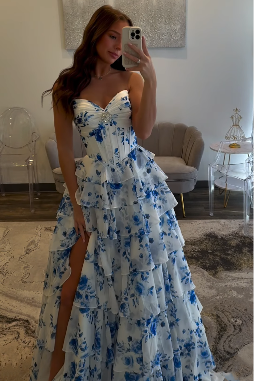 This chic chiffon A-line dress features a flattering sweetheart neckline and a strapless design. The delicate floral pattern adds a touch of elegance to this perfect prom dress. Expertly crafted, this dress is both stylish and comfortable, making it the...