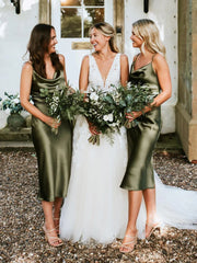Chic Satin Fitted Spaghetti Straps Midi Bridesmaid Dress