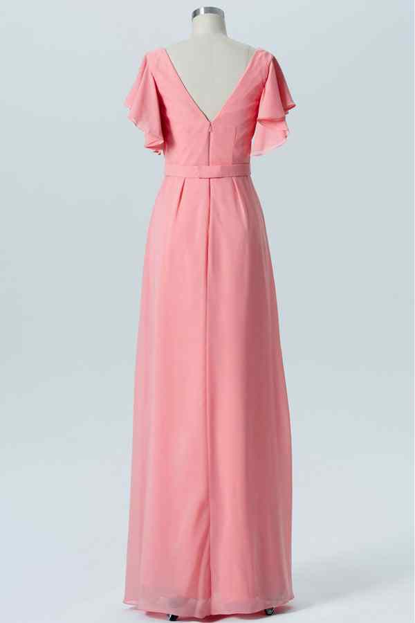 Coral A-line Faux-Wrap Chiffon Pleated Ruffle Long Bridesmaid Dress