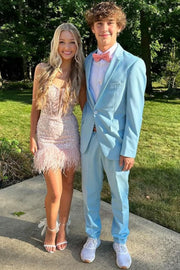 This bodycon lace homecoming dress features a cute bateau neckline and delicate spaghetti straps, adding a touch of femininity to your look. The intricate lace detailing and feathers add a playful element, while the bodycon silhouette flatters your figure. Perfect for a chic and stylish homecoming look.