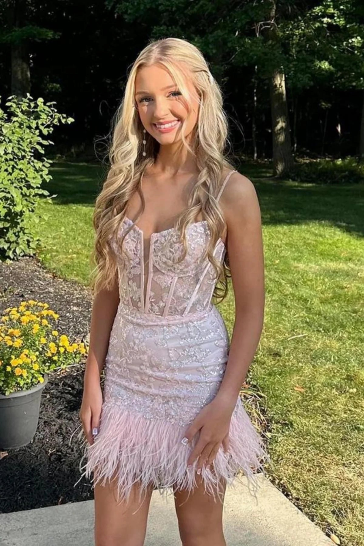Cute Bateau Spaghetti Straps Bodycon Lace Homecoming Dress With Feathers